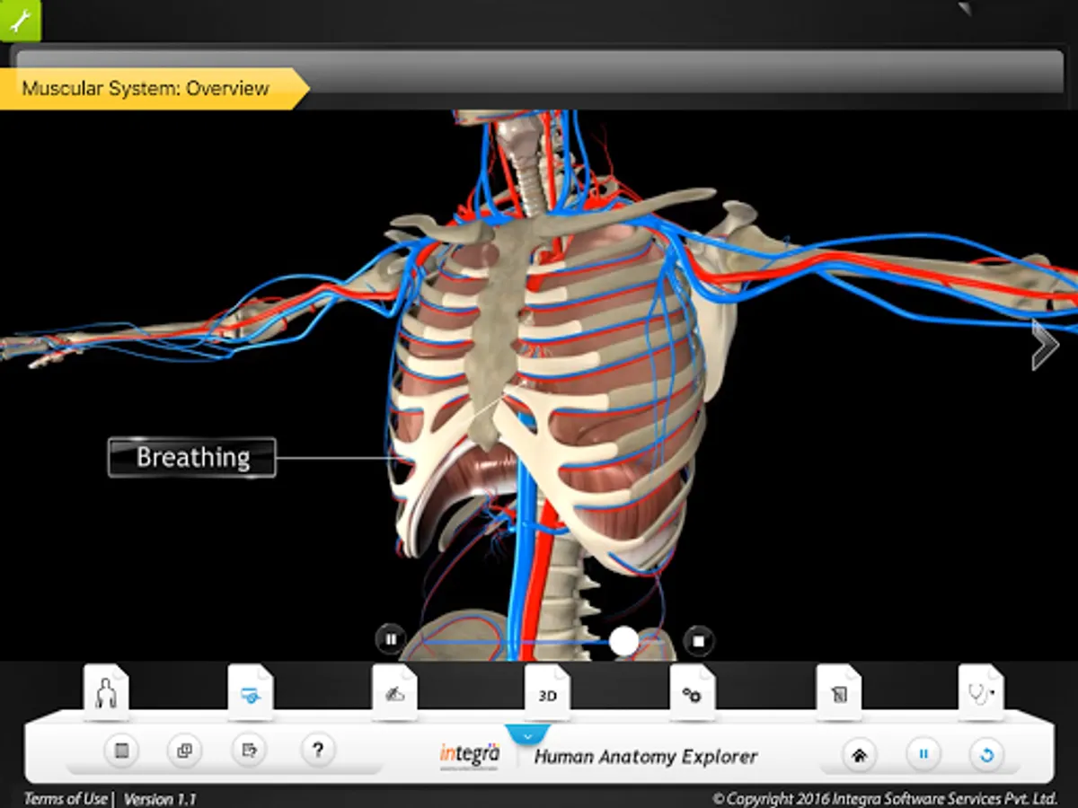 Human anatomy explorer covers Respiratory System, Circulatory System, Digestive system, Nervous system, Skeletal system, Muscular system, Urinary system, Reproductive system, Integumentary system, Endocrine system with the following features