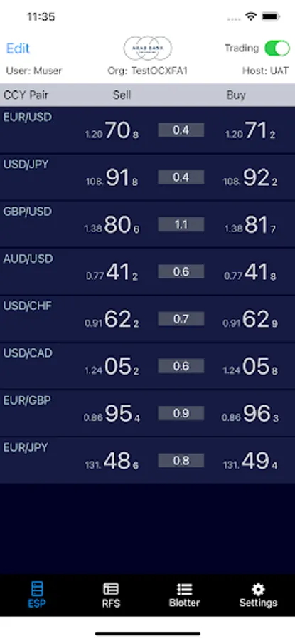 The FX Board contains a rate feed of user-defined currency pairs. The information displayed for each currency pair includes bid/offer rate, spread, intraday change (displayed in pips or percentage), and last updated time. Tapping on a bid or offer price opens the order entry panel to allow the user to place an order.