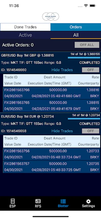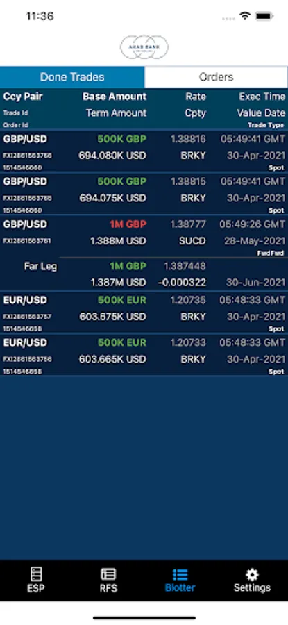 •The “orders list” displays Order ID, Status, Side, CCY Pair, Dealt (currency), Order Amount, and Fill Amount. In portrait mode, the following columns are added: Type, Time-in-Force, Order Rate, and Fill Rate. Order Details can be reviewed by simply tapping on an order.