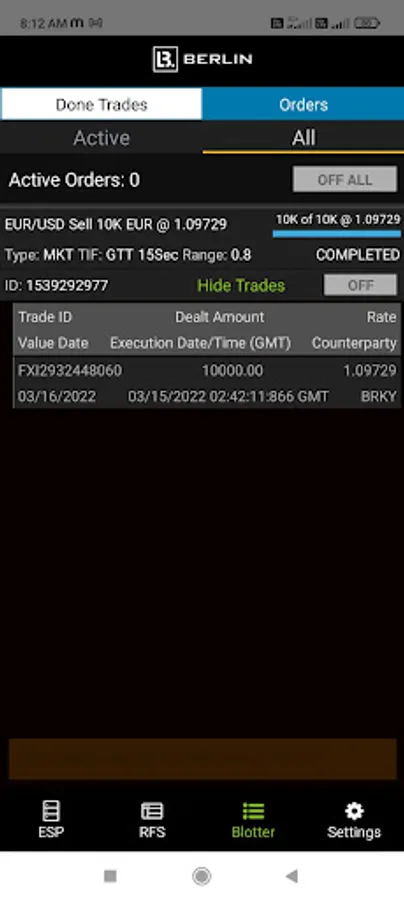 •The “orders list” displays Order ID, Status, Side, CCY Pair, Dealt (currency), Order Amount, and Fill Amount. In portrait mode, the following columns are added: Type, Time-in-Force, Order Rate, and Fill Rate. Order Details can be reviewed by simply tapping on an order.