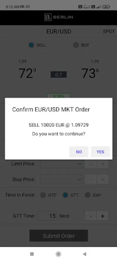 The Full Book aggregated view displays prices from up to 5 liquidity providers and the respective liquidity available. You’ll see price at size and all available liquidity at that price. It also displays the spread for each currency pair, the intraday change, and the last updated time. Tapping on the top of the book bid or offer price opens the order entry panel to allow the user to place an order.