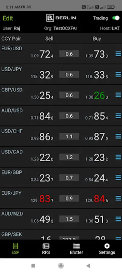 The FX Board contains a rate feed of user-defined currency pairs. The information displayed for each currency pair includes bid/offer rate, spread, intraday change (displayed in pips or percentage), and last updated time. Tapping on a bid or offer price opens the order entry panel to allow the user to place an order.