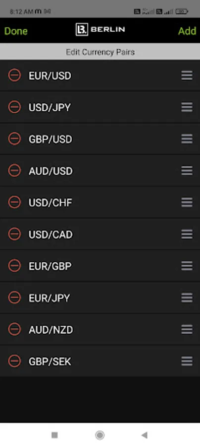 You can add and delete currency pairs, define a maximum order size, or disable trading temporarily altogether. Currency pairs can also be re-arranged in the order you prefer.