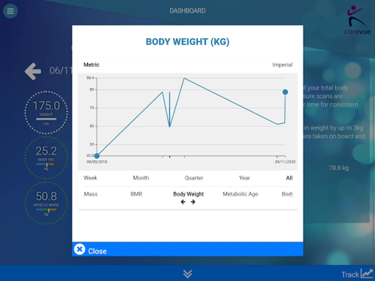 Corevue technology brings you fast, accurate body composition results using the latest advanced bioelectrical impedance analysis technology developed over the last 25 years. This gives you a true indicator of your inner health and, when monitored over time, can show the impact of any fitness regime or weight loss programme.