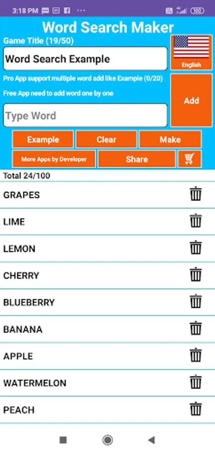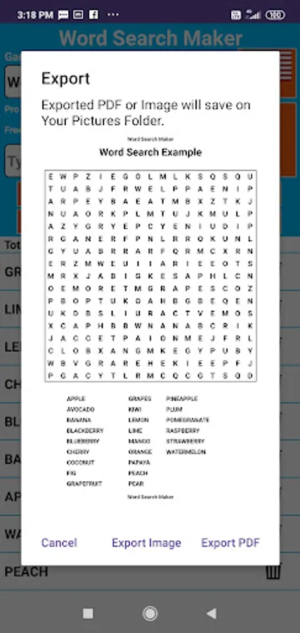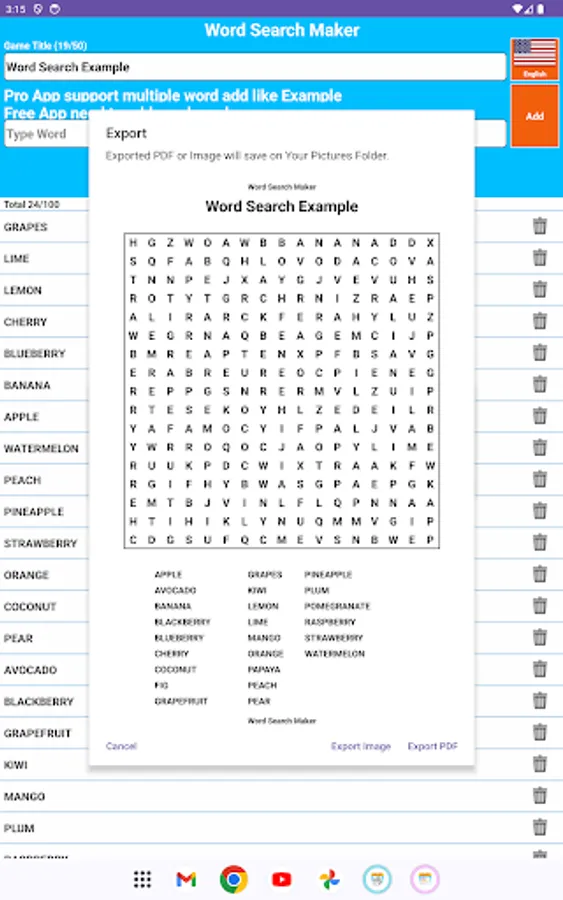 The app supports sharing your finished word search puzzles as an image or PDF using any of your favourite apps; from e-mail to Whatsapp, Facebook, Instagram, and more.