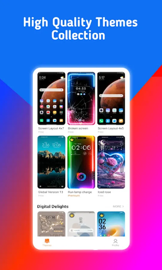 Choose from a variety of colors and styles to find the perfect theme for your device. And with the convenient wallpapers, icons, and fonts sections, you can easily customize every aspect of your device's appearance.