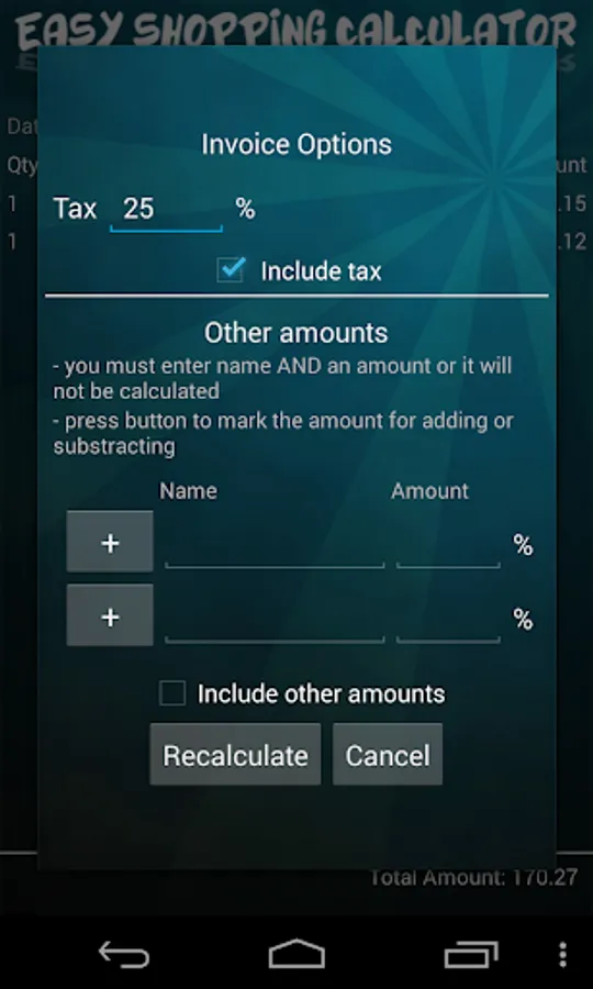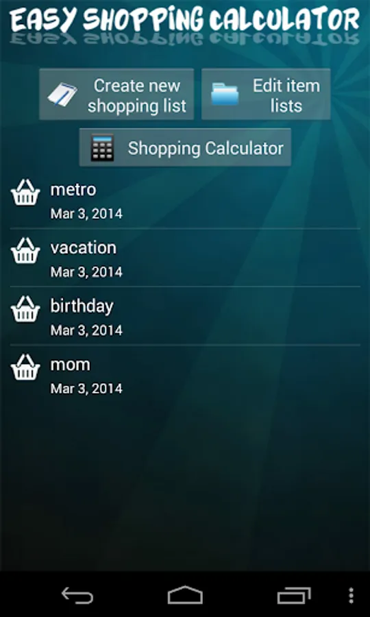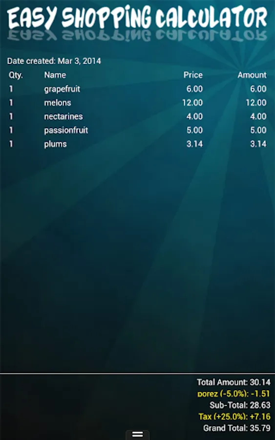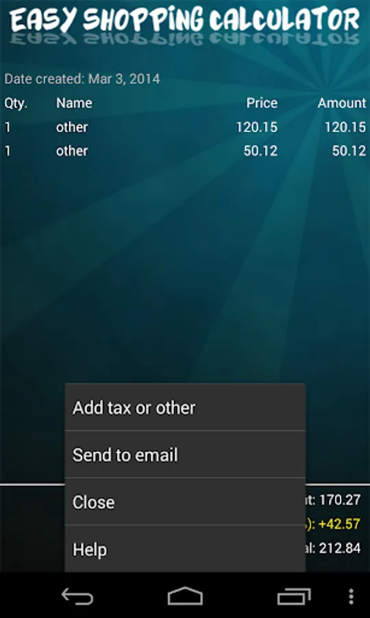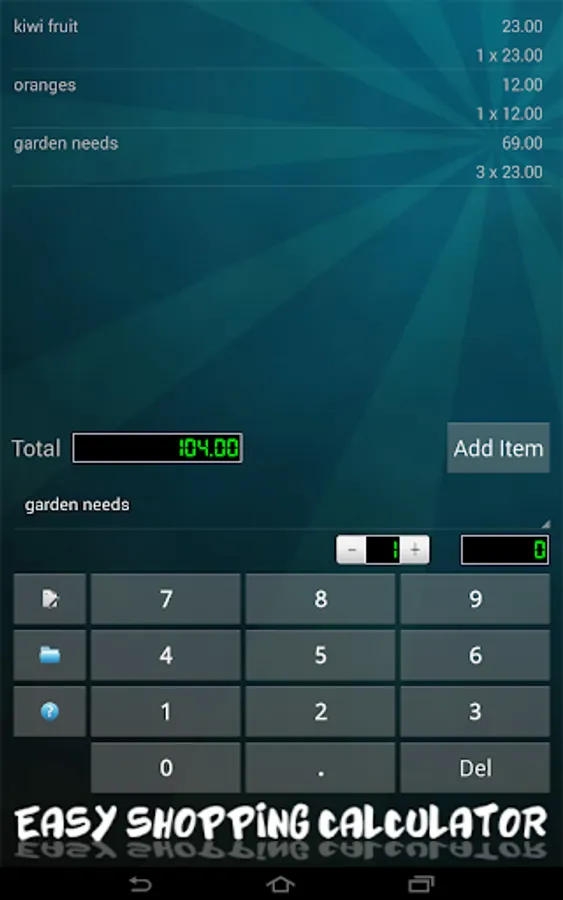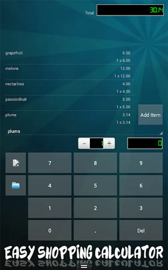 With Easy Shopping Calculator, you can create an entire list of items that you'll need when you get to the store. While shopping, input quantities and prices, and you'll have a running total as you continue shopping. An item not already listed in the app? Just add it to the items list. If there's and extensive number of items not listed in the app, you can create lists on your PC and transfer them to the app via USB.