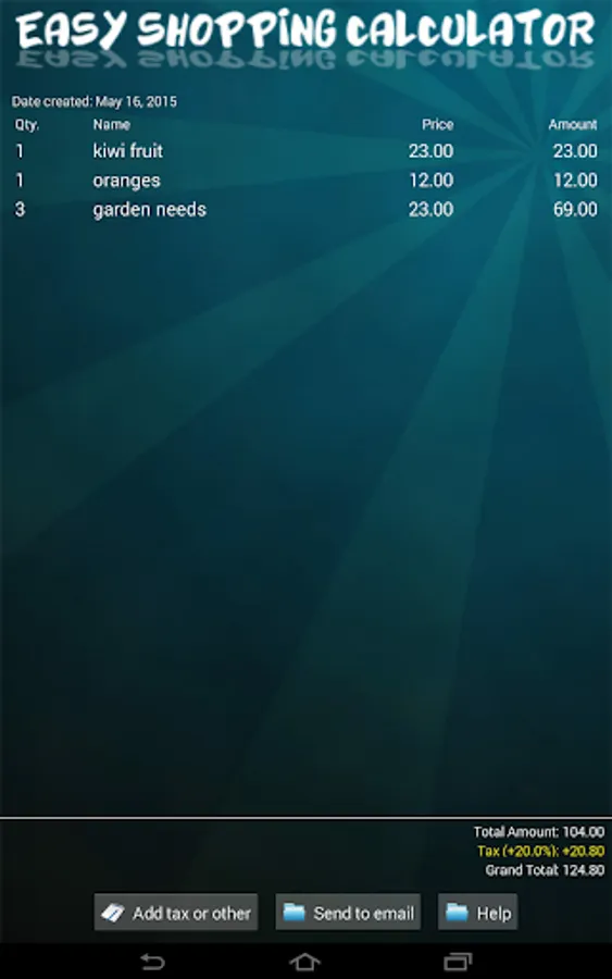 If you have a business, you can use Easy Shopping Calculator to cost out your job. Easy and convenient for when you're out in the field away from your computer. Even send bills and invoices via e-mail