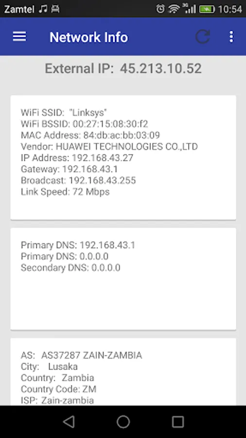 Network Tools has a simple interface, enabling you to receive full information on your network, find out internal or external IP, SSID, BSSID, broadcast address, gateway, network mask, country, region, city, the provider’s geographical coordinates (latitude and longitude) and other basic information such as dhcp and dns server information.