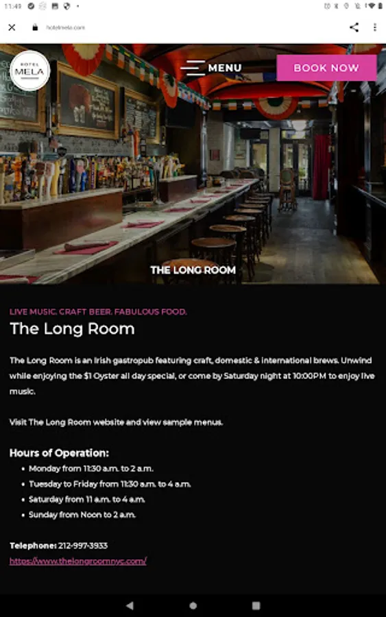 Whether your trip to NYC is for business or pleasure, you'll find a warm welcome at Hotel Mela, Midtown Manhattan's most gracious boutique hotel. From the moment of their arrival, our guests are embraced by the warmth of our modern, Italian-inspired urban oasis. Our NYC hotel features 234 modern guest rooms including suites. Additionally, the hotel features the Long Room, an eclectic Gastro Pub.