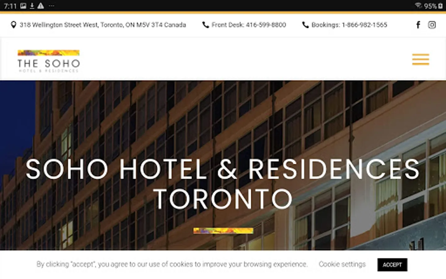 Interior design by Gluckstein, with the largest hotel rooms in downtown Toronto. SoHo Hotel rooms feature Italian designer furnishing with an exclusive 80 sq. ft. dressing area, marble bathroom with heated floors, Hansgrohe fixtures and Molton Brown soaps, Frette sheets and towels, 55” smart TVs, motorized drapes, and enjoy fine dining at Moretti Restaurant.