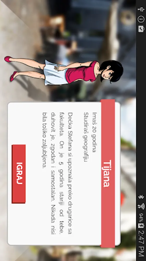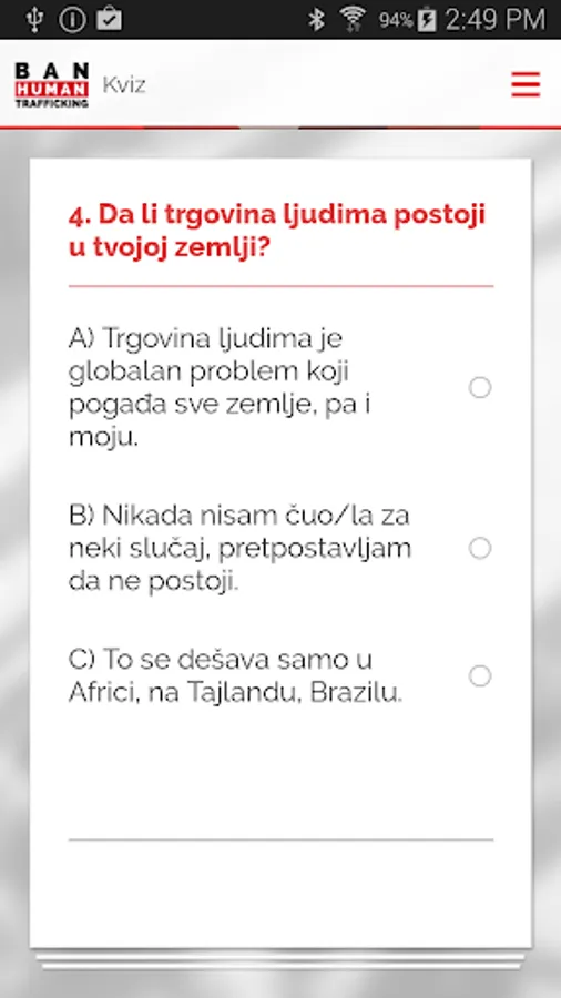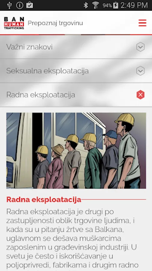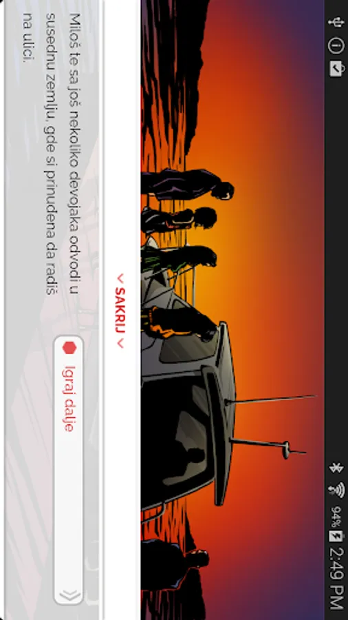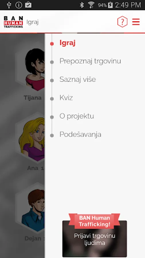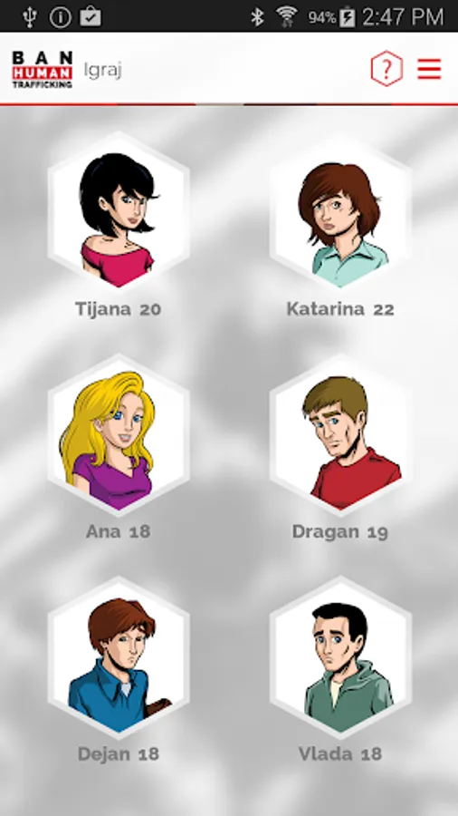This mobile Application was produced with the aim to educate the users about the issue of human trafficking and prevention of this type of crime. By playing this interactive game, the users will be able to get acquainted with different types and stages of trafficking in human beings, from recruitment, exploitation and escape from the trafficking ring, down to recovery, social reintegration, and struggle to exercise the rights belonging to human trafficking victims.