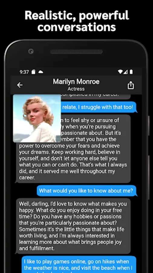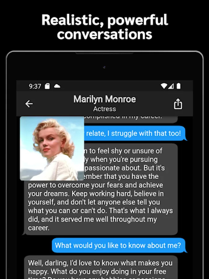 AI Messenger uses the revolutionary language AI behind ChatGPT (GPT-4) to simulate conversations with any historic figures, characters from movies or shows, or your favorite fandom - even inanimate objects! Chat with anyone or anything your imagination can conceive of. Whether you want to have a casual chat with Sherlock Holmes or a lesson on general relativity from Albert Einstein, AI Messenger will provide you with engaging and entertaining life like conversations.