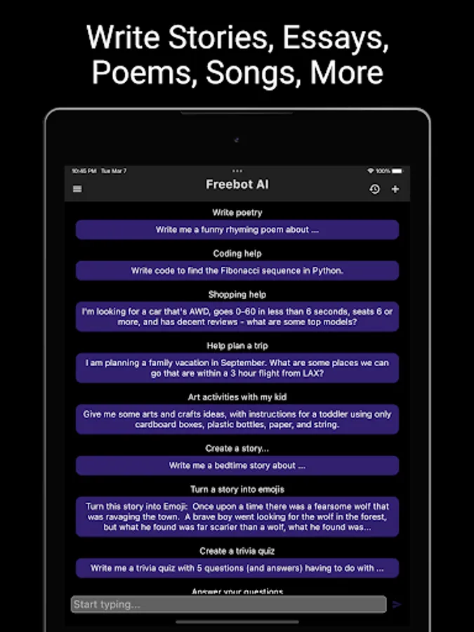 Write essays, generate code, compose poems, create stories, come up with witty tweets and replies, translate, brainstorm, question, converse, ask, anything - the possibilities are limitless!