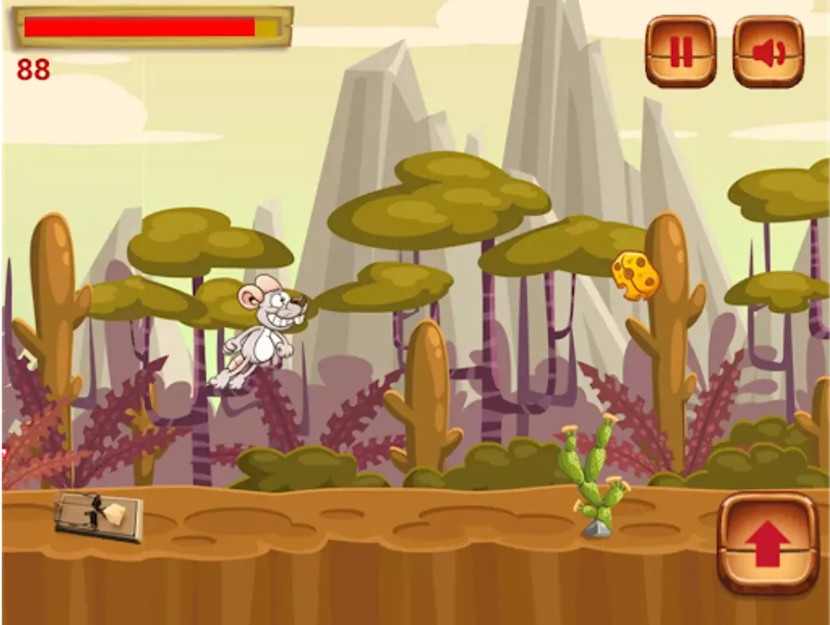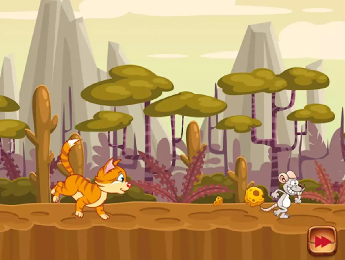 He found you while you were having lunch and starts chasing you. So you have to run as fast as possible if you want to survive. But she is smart and has set a lot of traps in your way that you need to jump over her. There are even cacti in this desert that can kill you if you hit them! Also remember that you have limited stamina and if you run out of it, you can no longer run and the Cat will catch you. So you have to collect cheese as you run to fill your stamina.
