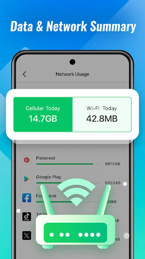• Network Tools – Perform speed tests and analyze data consumption by individual apps.