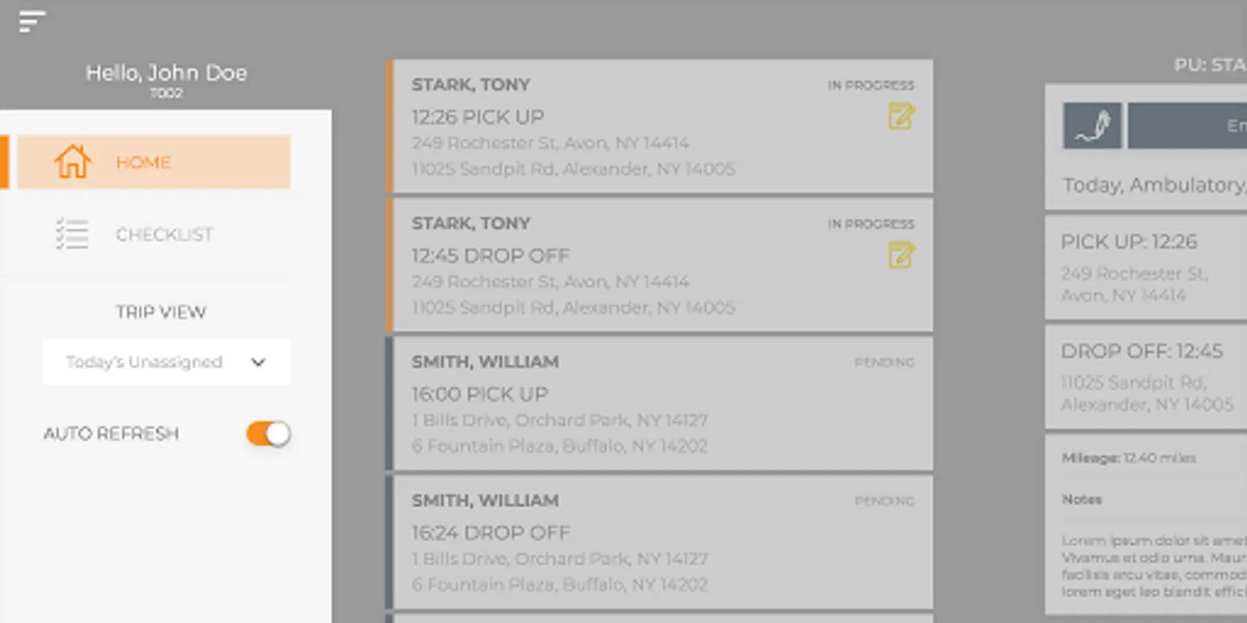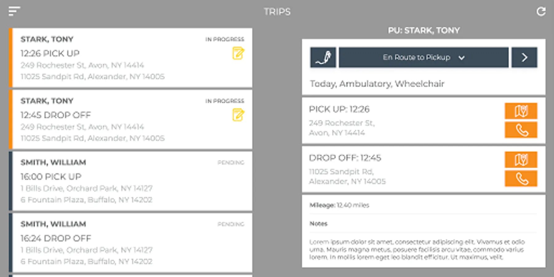- Comprehensive information about each trip presented intuitively. With one button, you can view special needs of a client, or phone ahead to let them know of any changes to their trip.