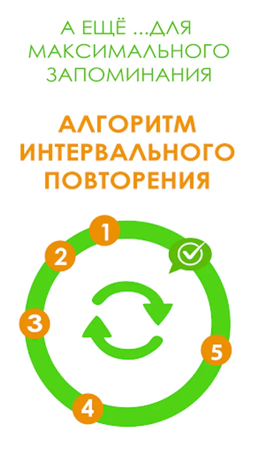 2. Встроенный АЛГОРИТМ Интервального Повторения позволяет переместить знания из кратковременной памяти в долговременную, таким образом, знания не забудутся через несколько недель, а перейдут на уровень устойчивого навыка.