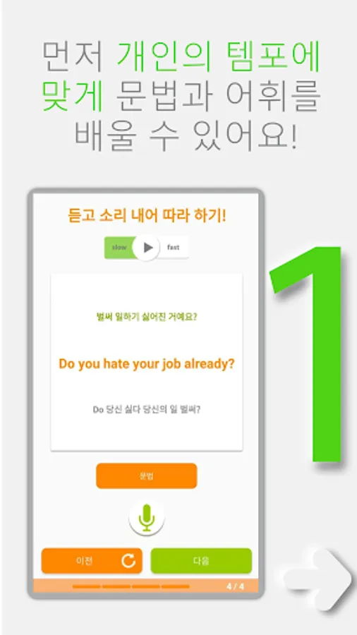 After installing the application on your phone, you will first go through two classes (easy/difficult), which will help you understand the methodology used in English Speech Builder.