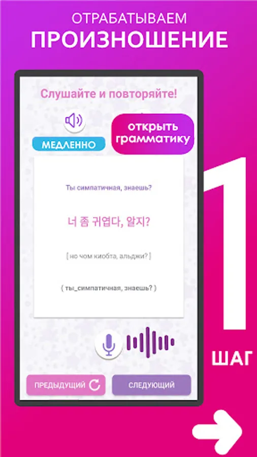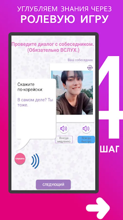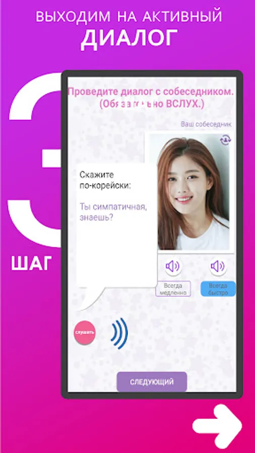 Thus, the main difference from other language applications is that the simulator not only offers useful material, but also, together with the user, effectively pumps it up to the SPEECH level on a long-term basis. The Dialogo "I SPEAK" course is the most effective self-learning tool for spoken Korean.