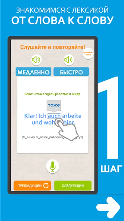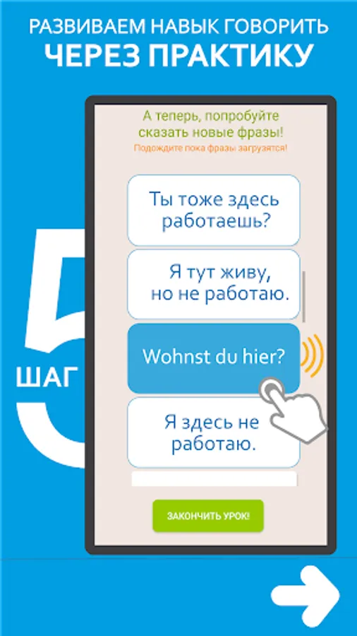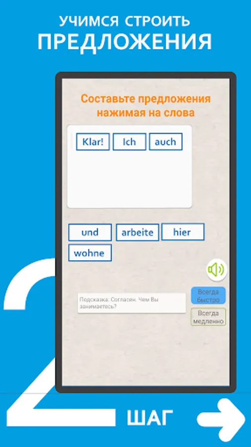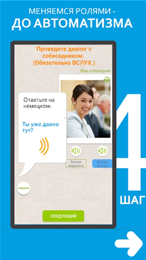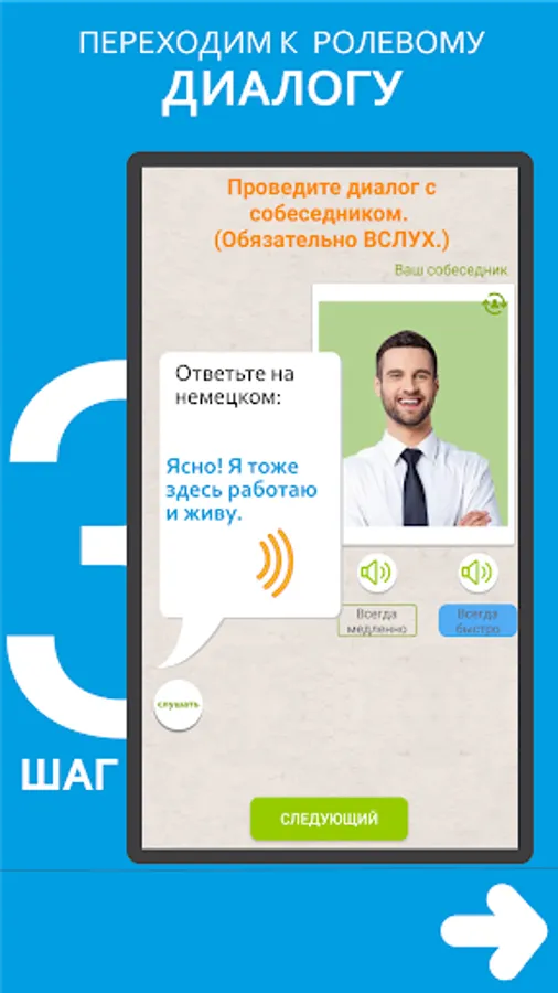 Learning the German language through conversational practice, relying on the most commonly used vocabulary and grammar. An intensive German course for practicing German speaking skills allows you to achieve a level of confident speech in the shortest possible time. The application has a built-in speech simulator for self-study of the German language with the effect of the presence of a tutor. The lessons are dialogues in German, the development of which will allow you to comfortably live in the country, solve everyday and formal issues, as well as establish contacts and maintain friendly relations with others. The program includes levels A0, A1, A2, B1.