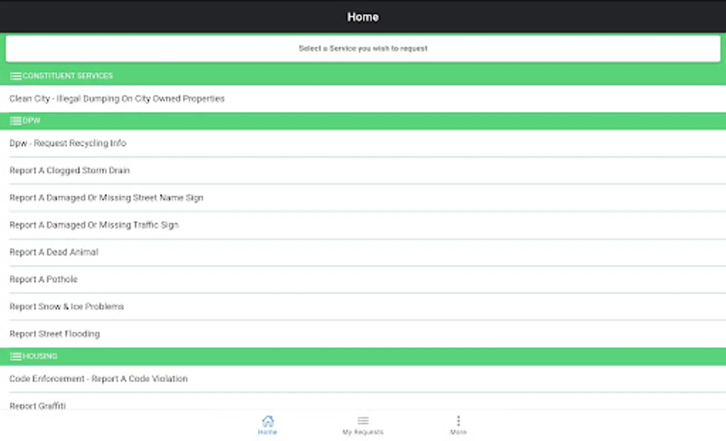 The tool enables residents to request services and report a wide range of issues similar to the City's 311 portal. This tool enables residents to take and attach pictures to requests for service and provide the exact location of the issue using GPS coordinates thus enabling the city to deliver services in a quicker and more effective manner.