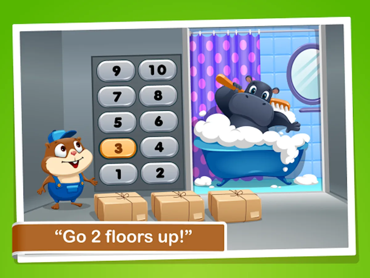 Real(ish) life problems, like missing fruit for Giraffe’s fruit salad or Lion’s lack of dumbbells, set kids off on a problem solving mission of package delivery. Kids will direct Hamster’s forklift to a numbered destination, dial phone numbers, count out items to be delivered, load the delivery truck using numerical ordering, and more!