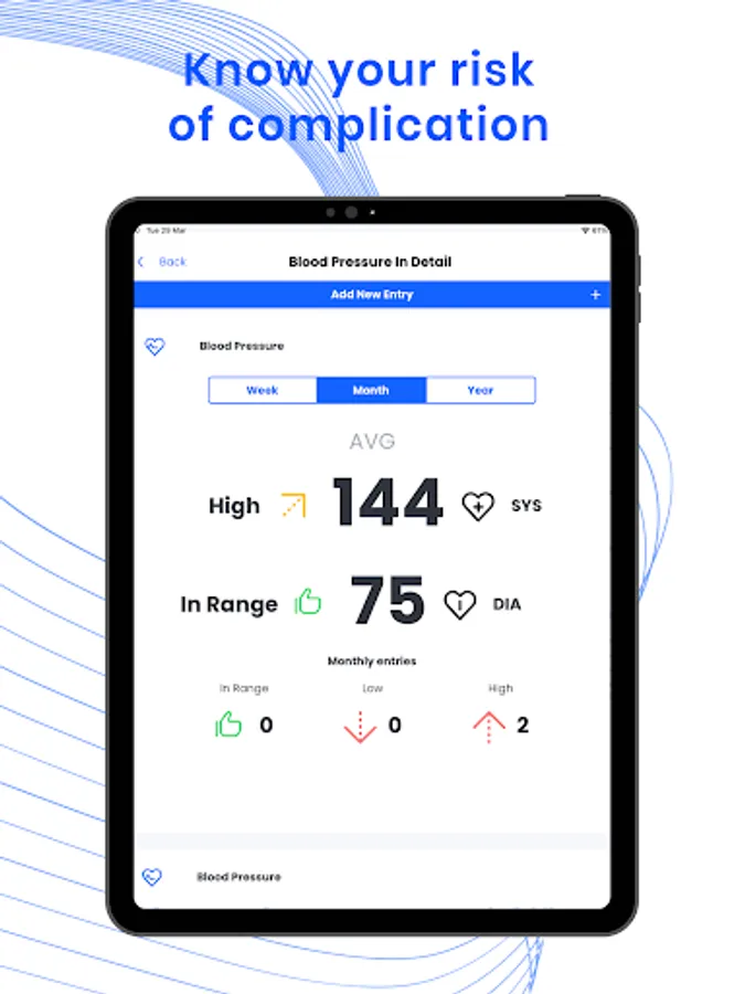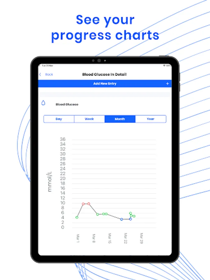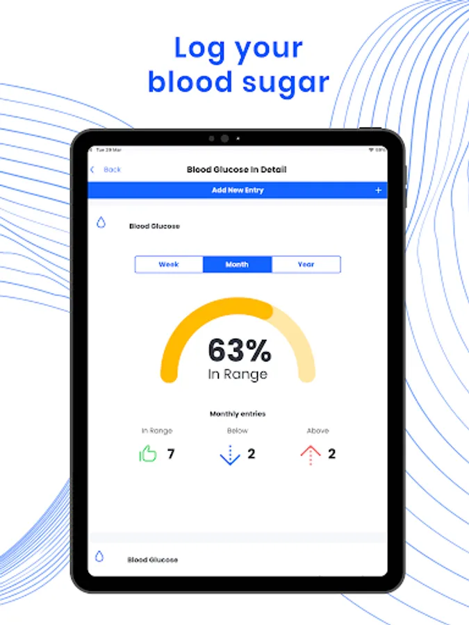 • Diabetes log: easily log your blood pressure, activity, body mass index, blood glucose levels and more