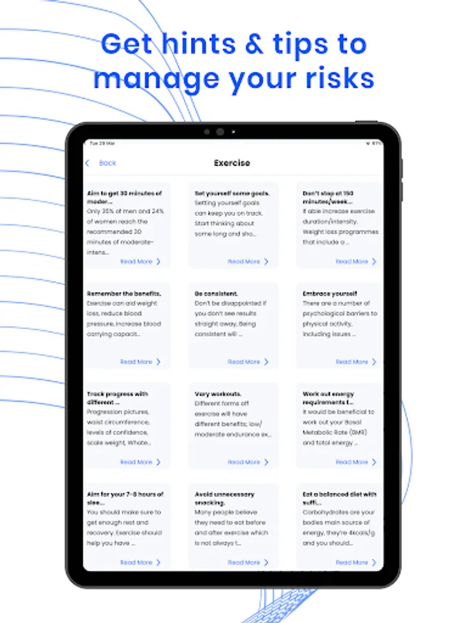 • Diabetes tracker: get reminders and tips on how to look after your blood pressure, insulin, glucose, diet, exercise, feet, eyes, kidneys and cardiovascular risks