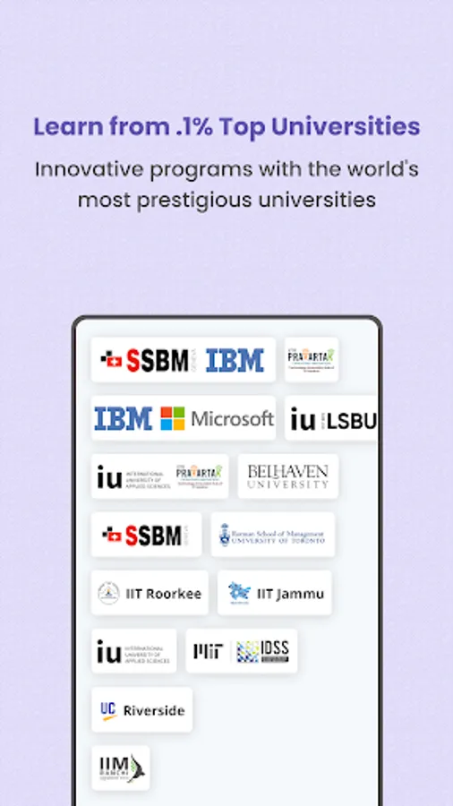 Explore our certification & Degree programs in collaboration with top universities like IIT Madras, IIT Roorkee, IIT Guwahati, IU Germany, University of Essex, University of Liverpool, MNIT Jaipur, Belhaven University, etc.