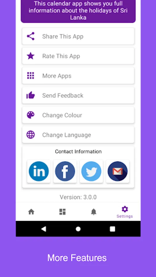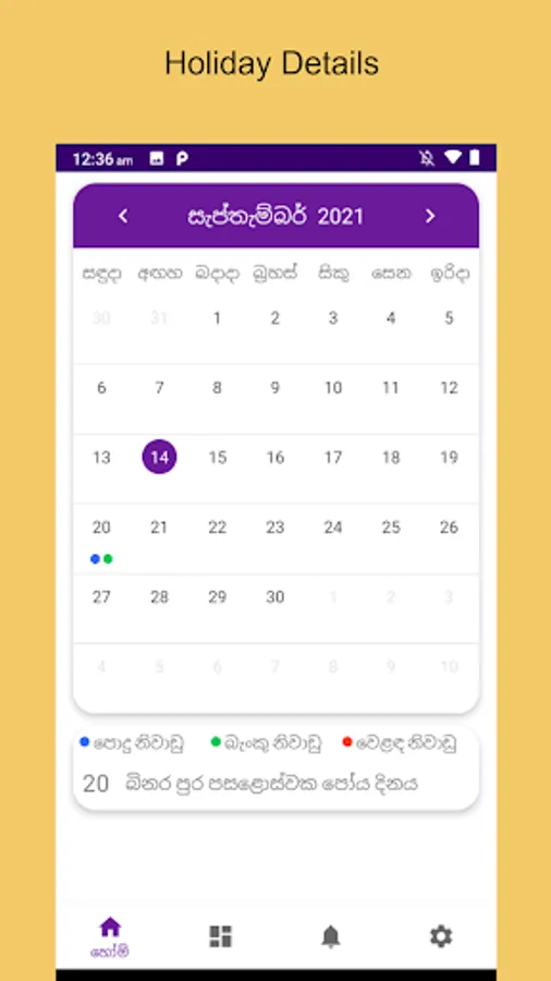 Sri Lanka Calendar is a mobile app which shows all the Mercantile, Public, Poya and Bank holidays of Sri Lanka. You can view months swiping left and right, and swipe up to see month holidays. Special holidays (if have) issued by the government will be added on startup.
