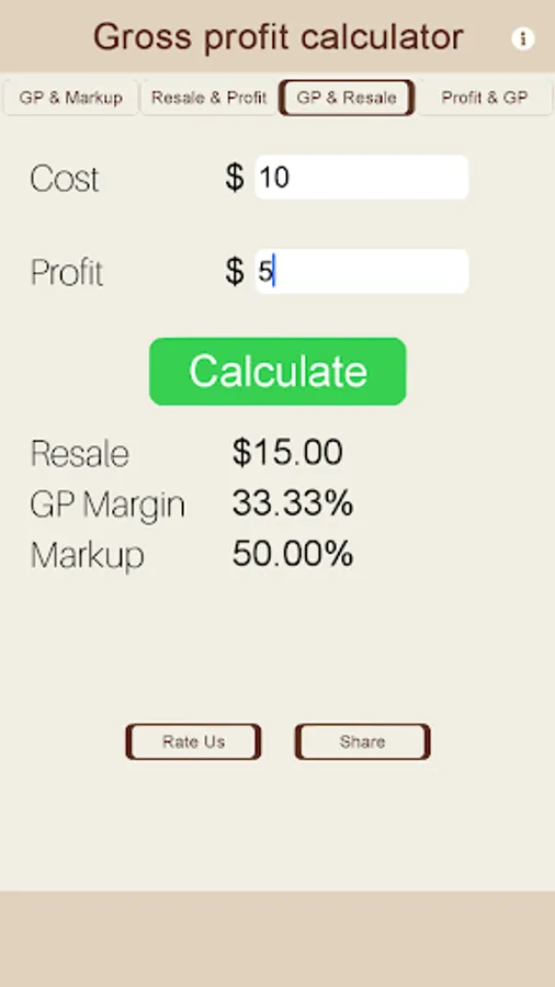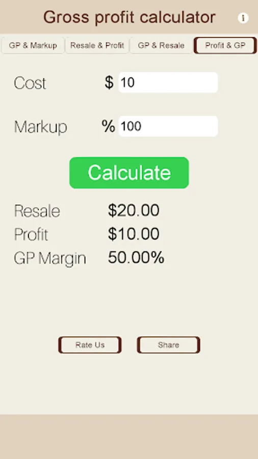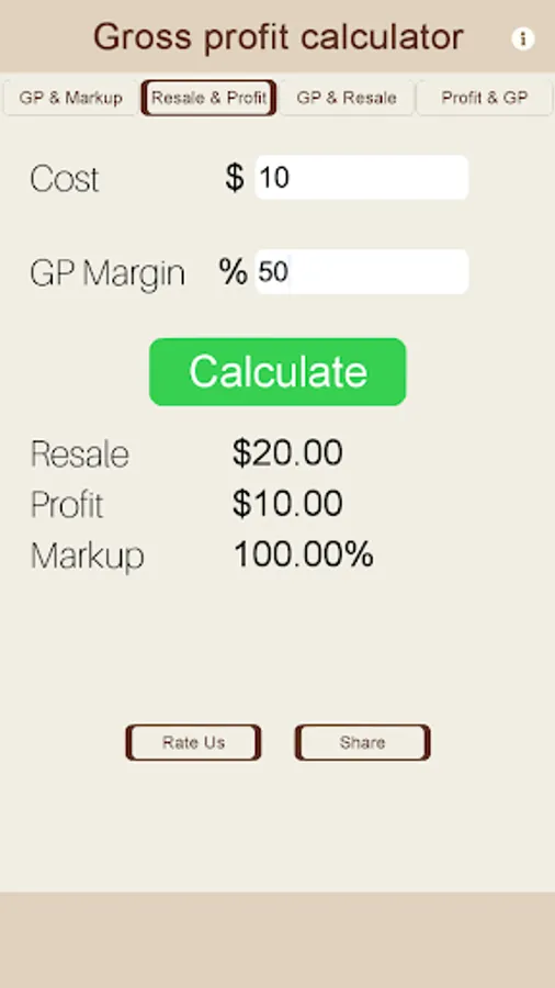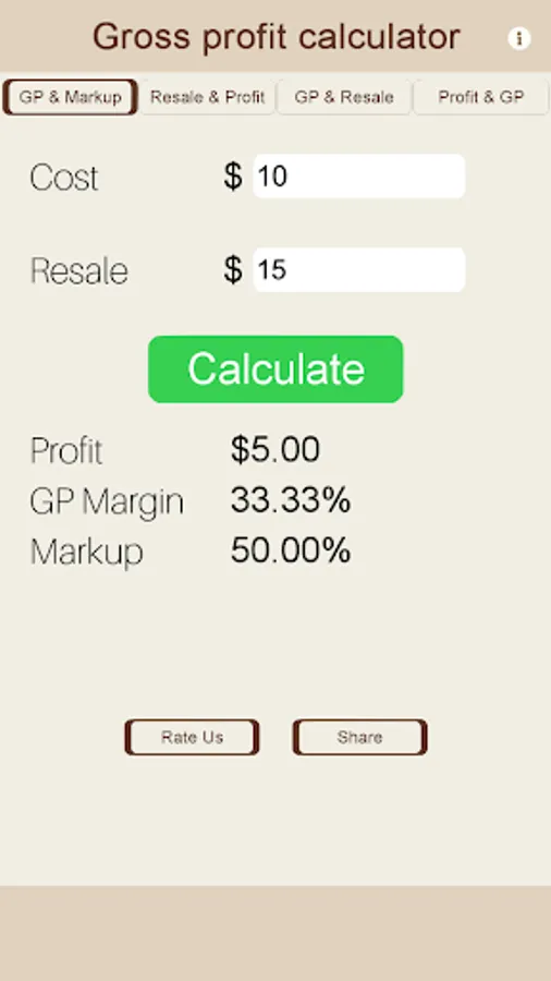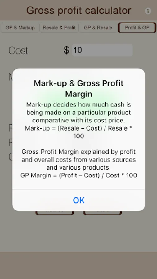 Definitions and equations for Mark-up percentage and GP Percentage is explained by clicking on Info icon in App. This will solve Many people’s confusion between Mark up and GP.