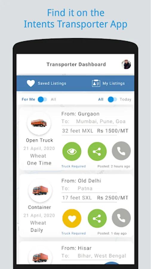 The intents app is available in multiple languages, so people see your listings in their own language and call you. Please share the app with your other transporter friends as well and get loads and truck requirements from them directly.