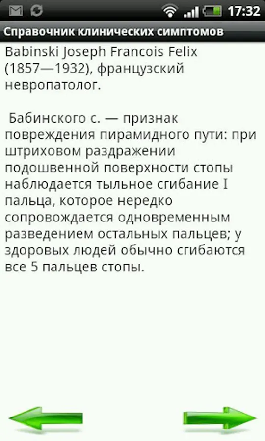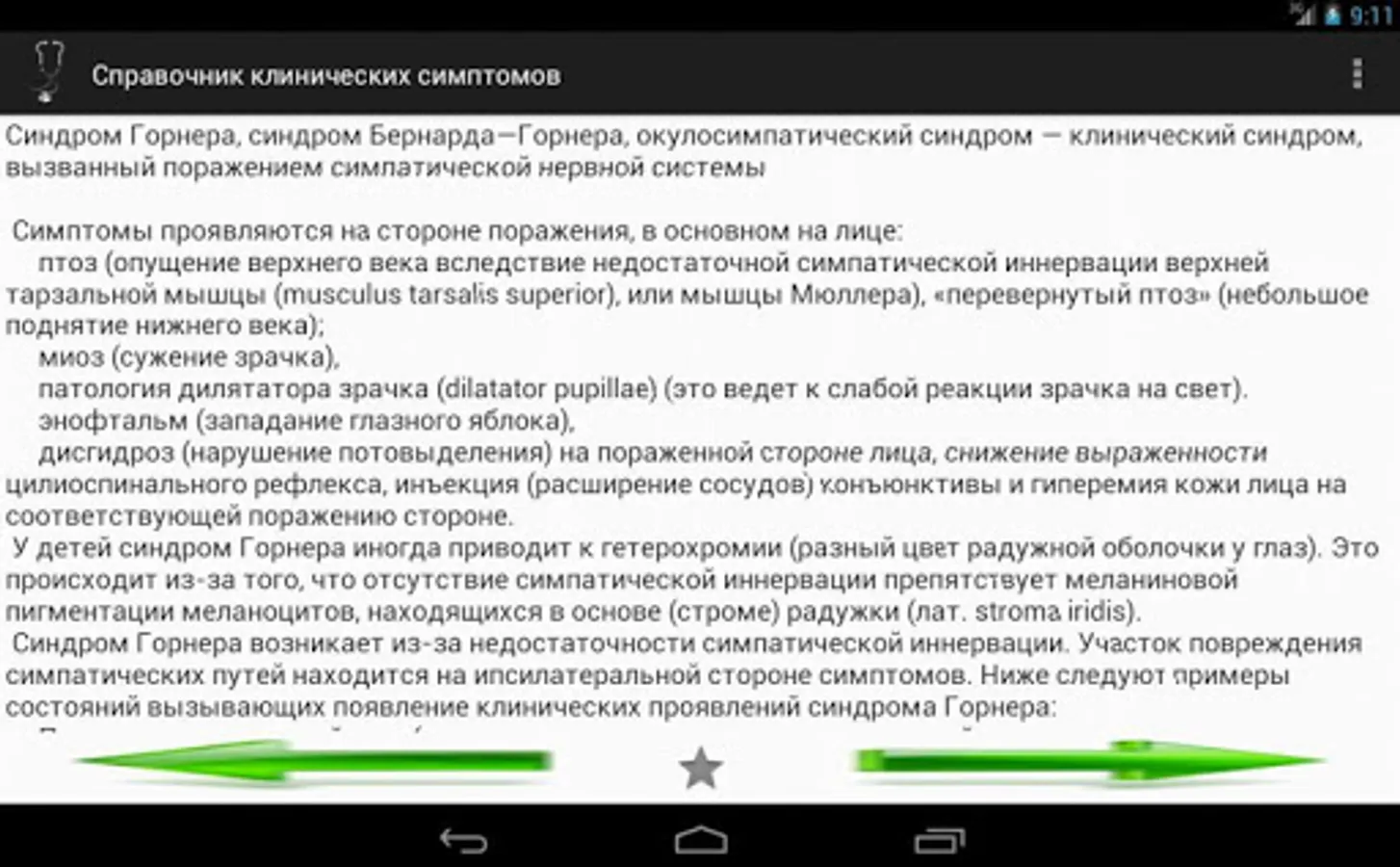 Offline-eponymous directory (named by author's name, the patient, a literary character, and so on.) Clinical symptoms and syndromes of various diseases. Symptoms and syndromes were selected manually for a long time as a result of analysis of the special periodicals, books, monographs, terminological dictionaries. In this program only includes materials, have not lost their relevance today.