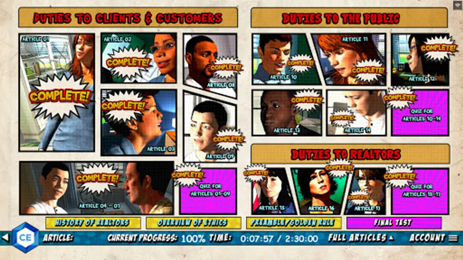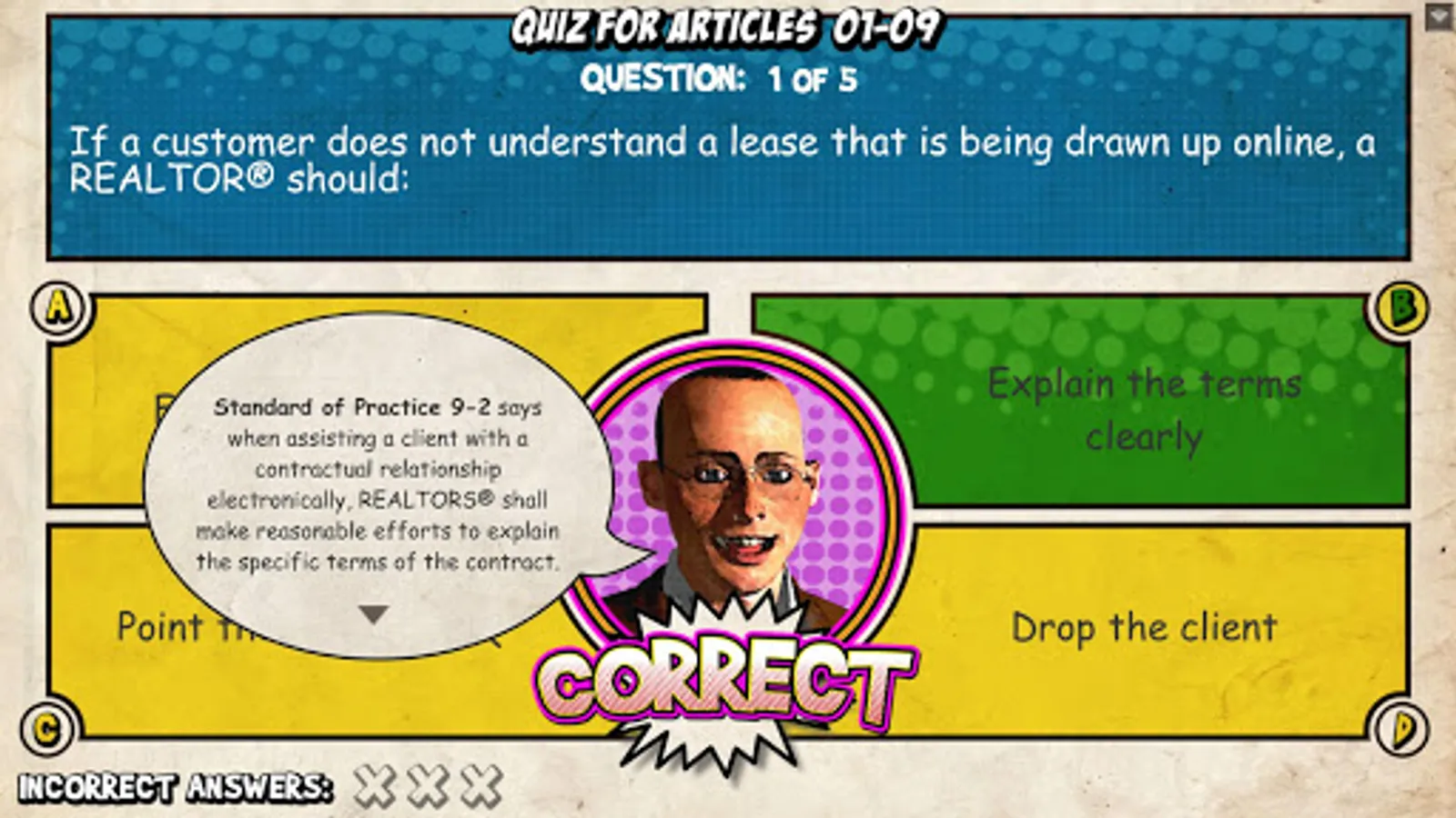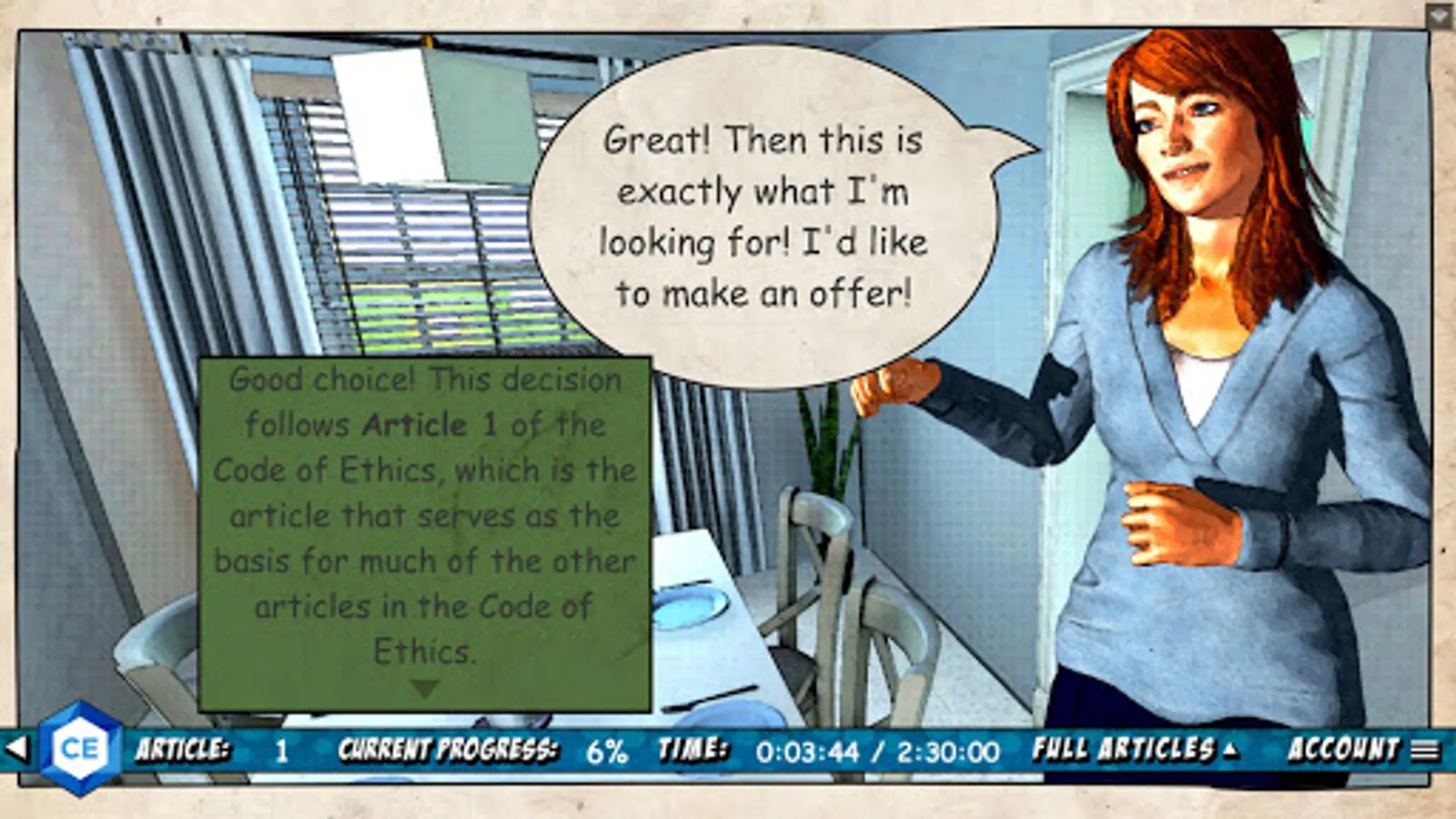 The Ethics Adventure is an interactive graphic story designed to educate REALTORS® on the Code of Ethics, which the National Association of REALTORS® bases much of its conduct on. You’ll guide a REALTOR® through the purchase of his client’s home while experiencing scenarios that relate to all 17 articles of the Code of Ethics. You’ll also learn about many of the different standards of practices that make up each article.