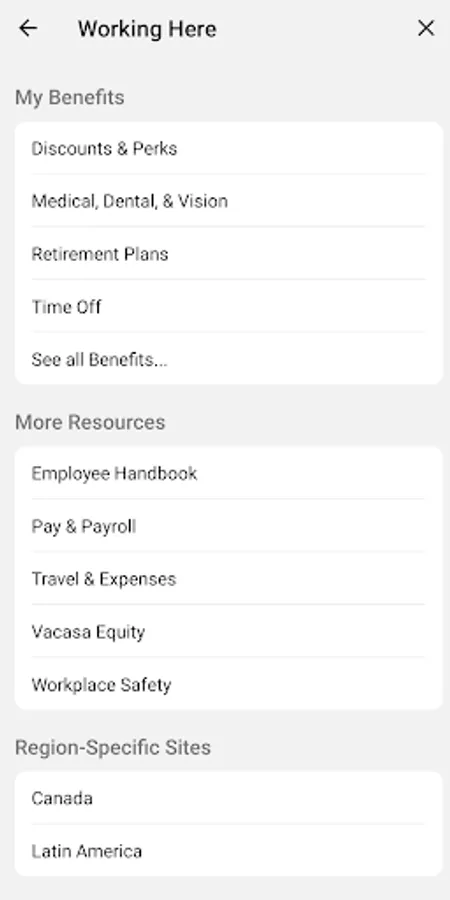 You will be able to find important information such as your health benefits, how to manage your paid time off, and details on our Employee Resource Groups. All of this information is permissioned based off of your role. This means you will be able to quickly find the details relevant to you and not need to sort through unrelated documents.