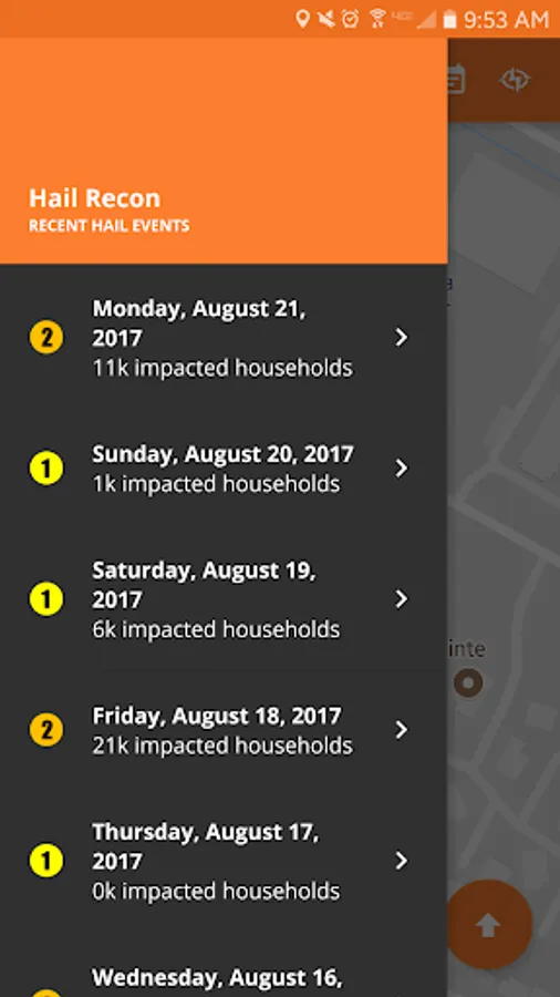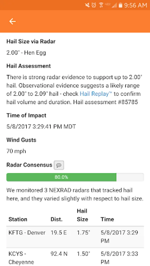 - Radar accurate hail swaths allow you to pinpoint where the hail fell in ten highly accurate levels, ranging from ½” to over 3” hail in ¼” increments.