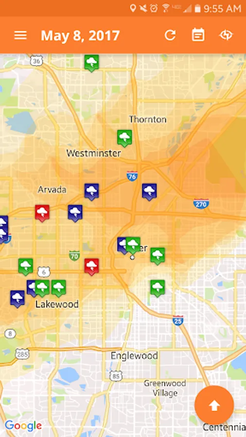 - Location indicator lets you see exactly where you are in relationship to the hail swath.