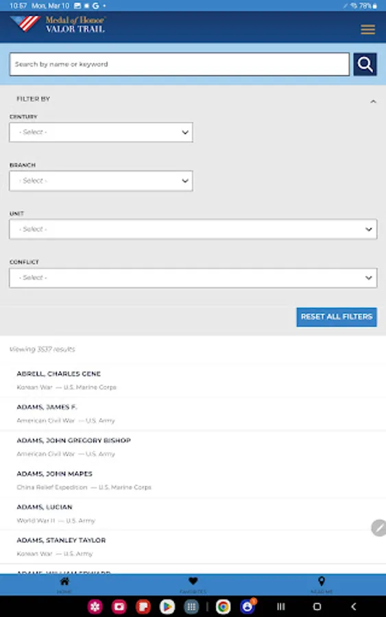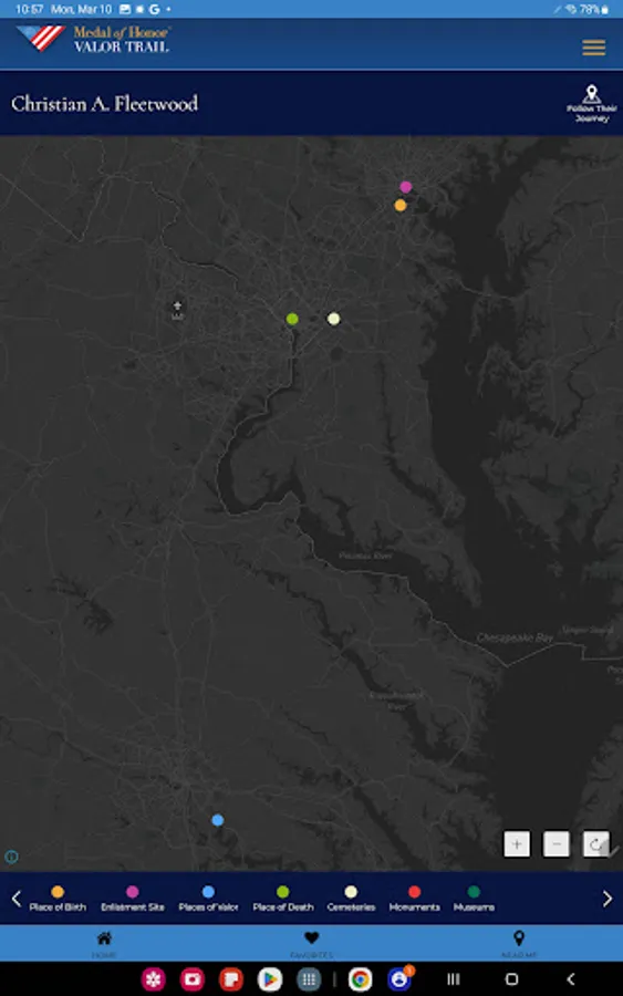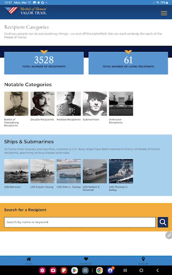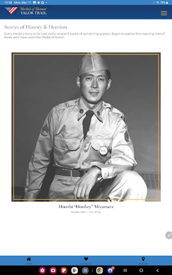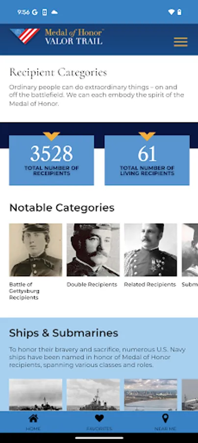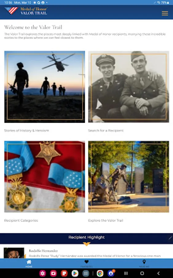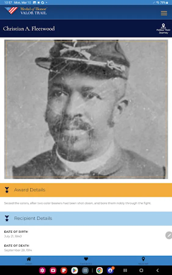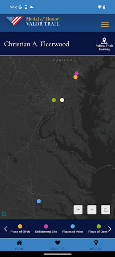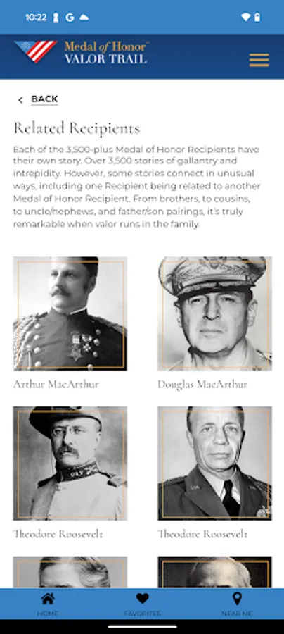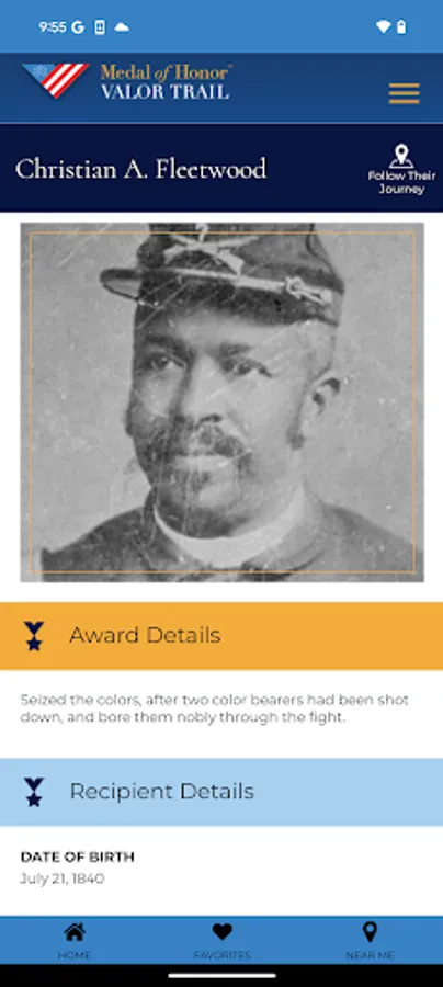 The Medal of Honor Valor Trail™ App brings history to life by allowing users to explore the extraordinary stories of Medal of Honor recipients through an interactive, location-based experience. Developed by the American Battlefield Trust and the Congressional Medal ofHonor Society, this app provides access to a global network of sites tied to the lives and legacies of those who have received the nation’s highest military honor.