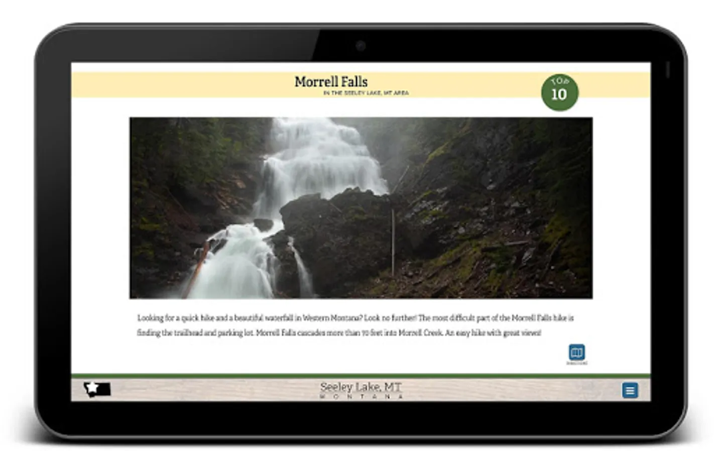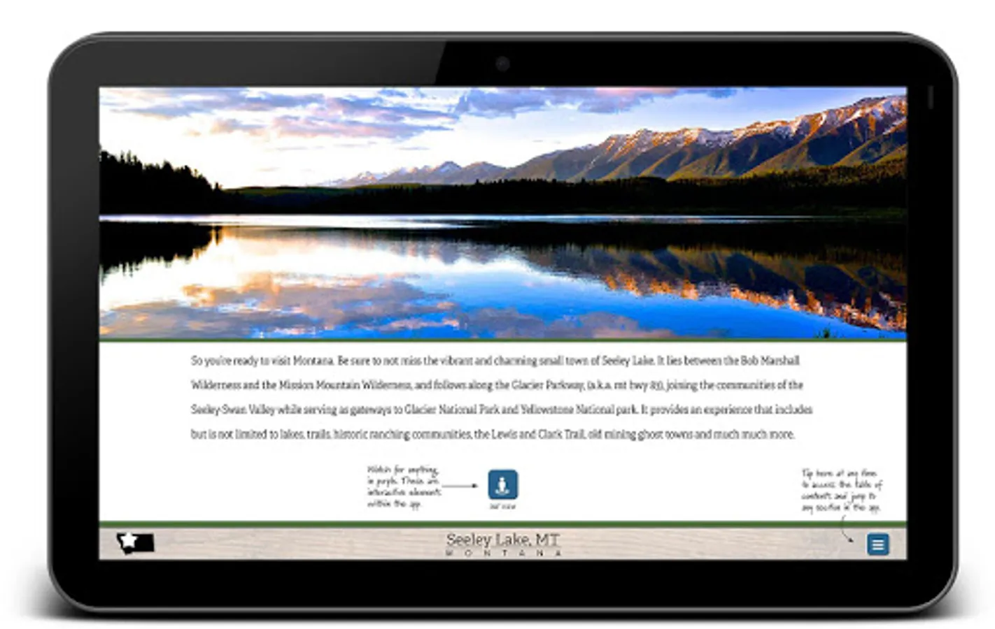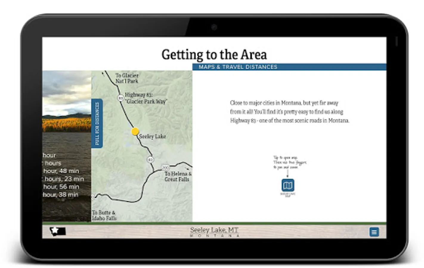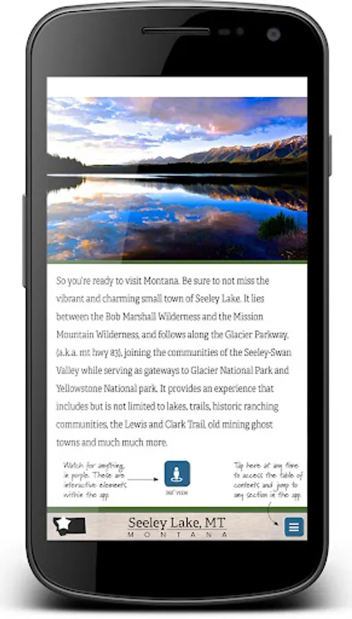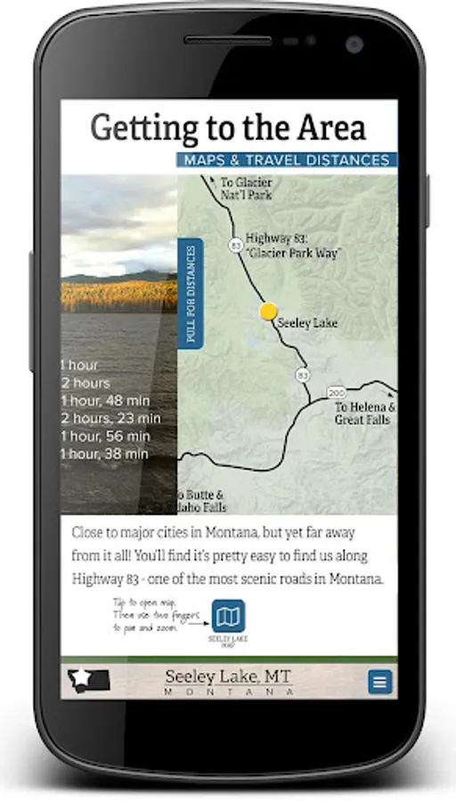 An interactive tourism app for the Seeley Lake, MT area containing maps, photos and other information - most of which can be used offline. Engage with 360° imagery, videos, maps, and much more to help you plan your vacation to the Seeley Lake area.