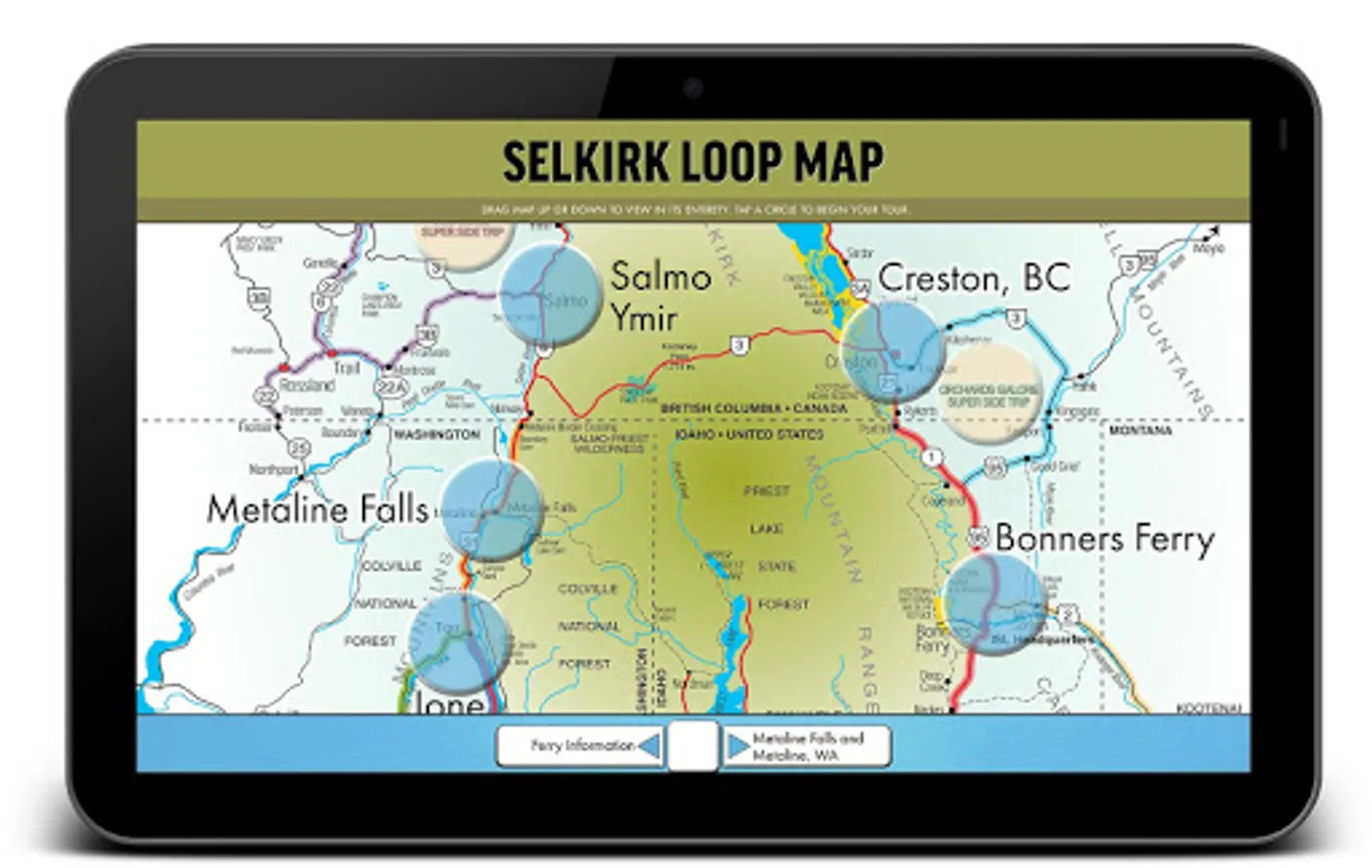 We want to help you explore the International Selkirk Loop, designated one of only 32 All-American Road National Scenic Byways in the U.S. This interactive app contains information, map, ferry schedule, border crossing information and tons of things to see and do along the way. You’ll discover the wonderful surprises that await you around every corner – but don’t take only our word for it. In fact, the Selkirk Loop has garnered heaps of recognition. Rand McNally selected it as one of the five “Best of the Roads” for its 2009 atlas and Sunset Magazine named it “The West’s Best Scenic Drive.” So put yourself in the driver’s seat for one faulous drive chock-full of scenery and friendly towns on the International Selkirk Loop!