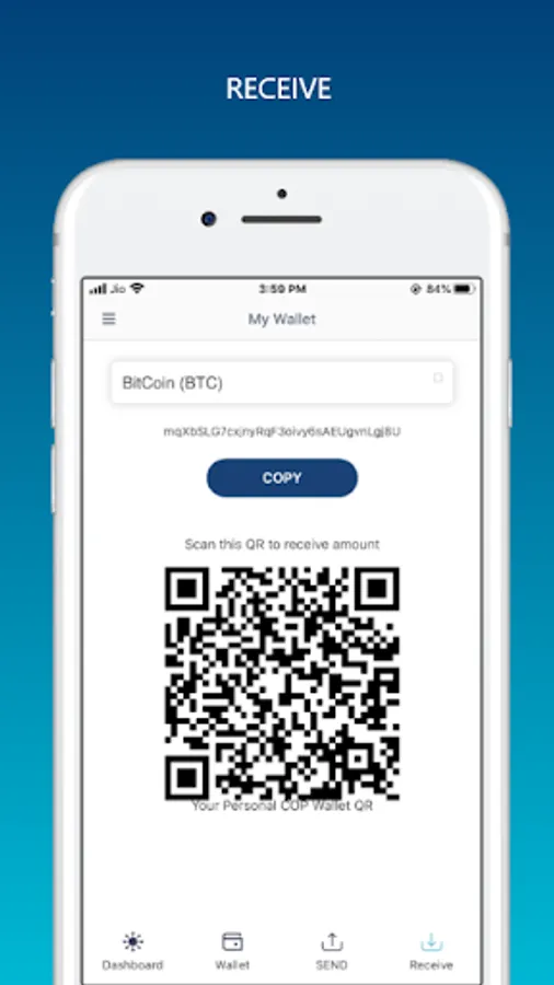 Receive: By providing wallet address or letting them scan your QR code a user can receive crypto coins or tokens to their wallet from any user.