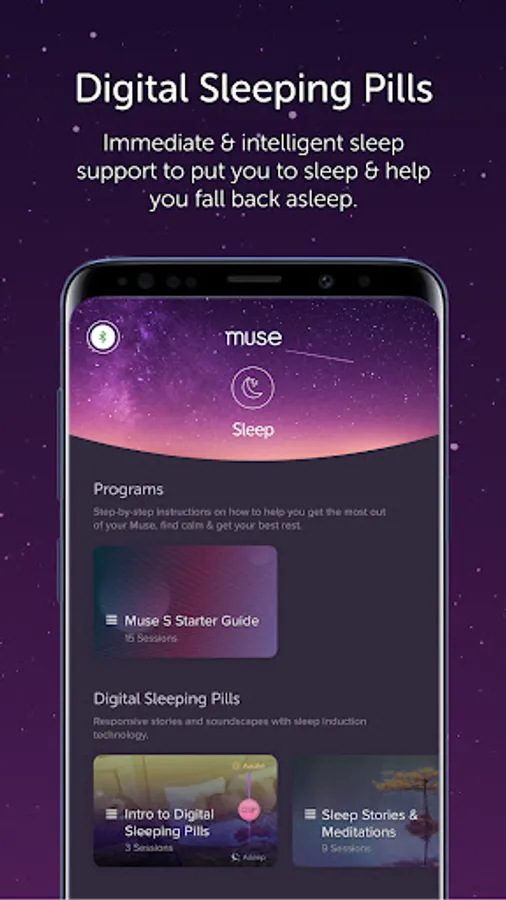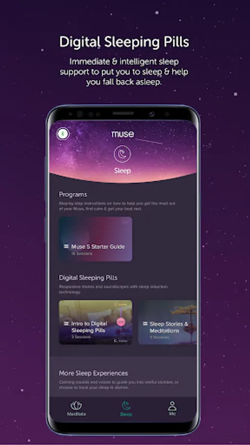 Muse’s Sleep Experiences include Overnight Sleep Tracking and Digital Sleeping Pills or ‘DSPs’. DSPs use smart-fade technology that gently modulates your auditory experience to help you fall asleep and fall back asleep if you’ve woken up during the night. You’ll also have access to Sleep Journeys, Guidances, and Soundscapes which do not include smart-fade technology.