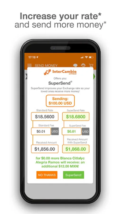 Download the InterCambio Express app and start sending money to your family members now, from and wherever you want. Choose the exchange rate that suits you best, using SuperSend®.