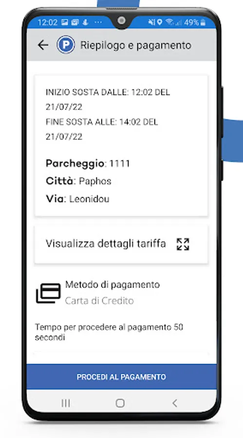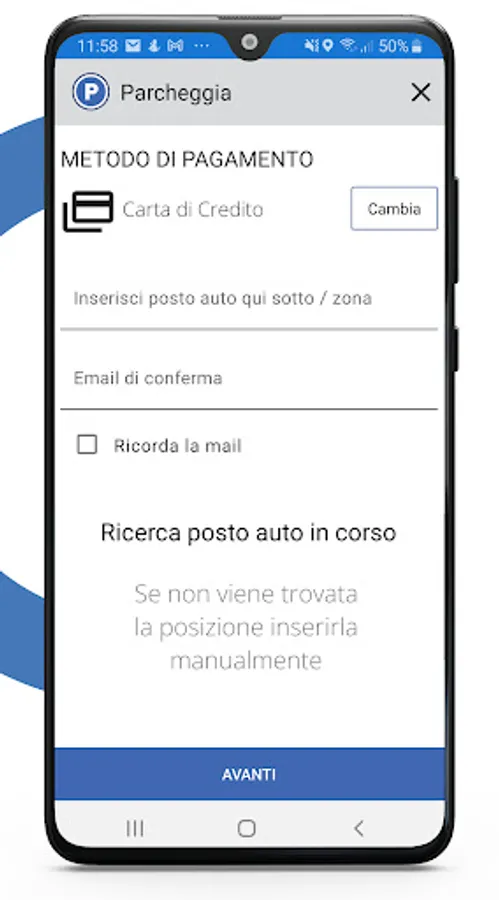 Se non ti registri, potrai comunque accedere ai servizi di ricerca parcheggio, navigazione e pagamento, ma potrai utilizzare solo il metodo di pagamento predefinito, ovvero la carta di credito.