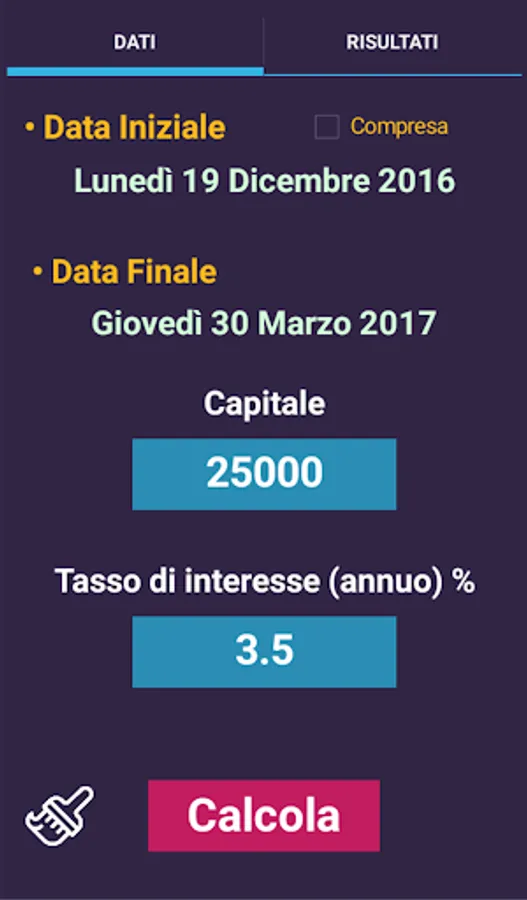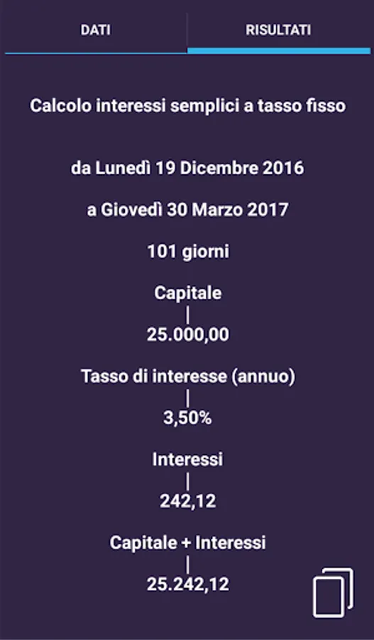 The application, intended for both public administrations and lawyers, consultants, accountants, tax advisers, allows the calculation of the simple interest without capitalization which, by adding to the initial capital, the interest calculated in the period defined by the user; to copy the results to the clipboard, long touch the icon at the bottom right of the results panel; to reset the data, long touch the icon at the bottom left of the home panel.