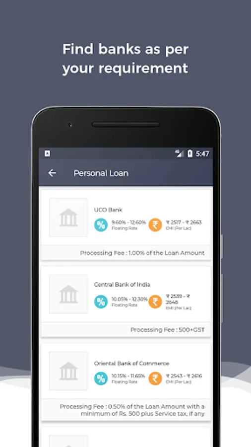 Compare Banks: Now comparing different banks based on your loan requirement is no more a hassle. Whether it's personal loan, home loan or car loan you want to avail, Interest Rate Comparison & EMI Calculator App removes all financial hurdles coming your way, helping you to take the right decision. When it comes to using this App for comparing the banks, all you need to do is simply enter the fields such as Required Loan Amount, Monthly Income,Tenure, Employment Status, etc and you are done. That’s Right! It is that simple. The moment you enter the inputs, you need to select a bank in order to know the interest rates of that lender. A user can select multiple banks also to compare the rates, per lakh EMI and also the processing fee. This App gives you a user-friendly interface to compare different banks on the basis of rates, EMI and charges so that you can easily choose the best lender.