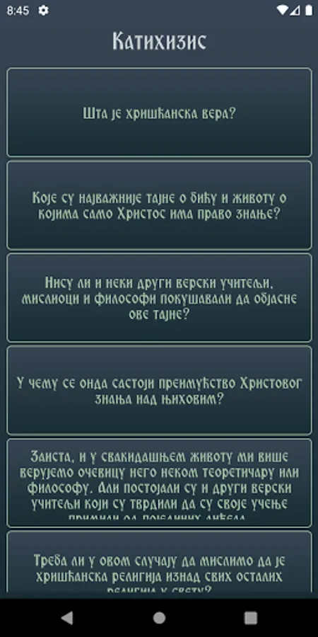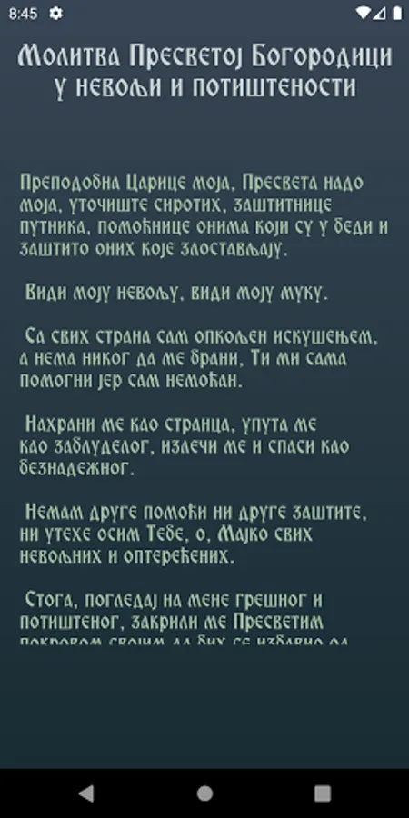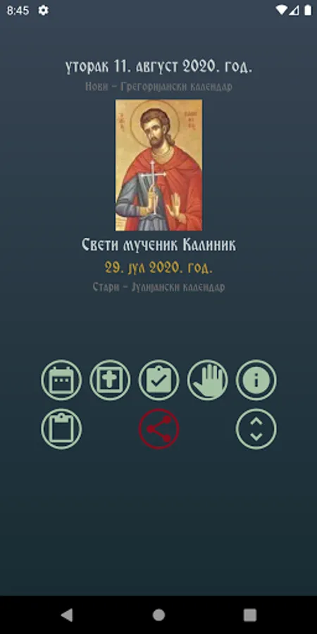- Православни календар на првој страни приказује грегоријански датум, јулијански датум, икону светитеља за тај дан, име светитеља за тај датум и да ли је дан поста или не. Превлачењем прстом преко дисплеја на леву или десну страну умањује се или увећава датум за један дан и сходно том новом датуму мења се икона и све остало. Превлачењем прстом одоздо на горе, или одозго на доле, враћа се на данашњи - тренутни датум.