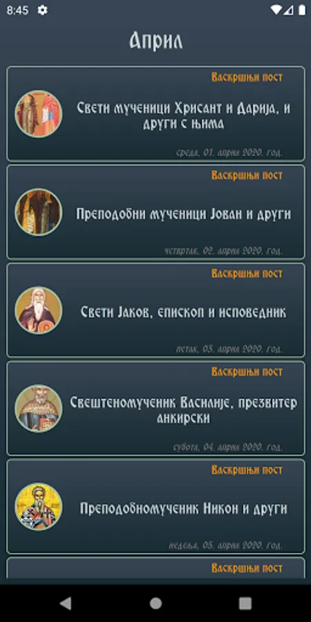 Црквени календар седржи за сваки дан име светитеља, икону и житије кратко житије.