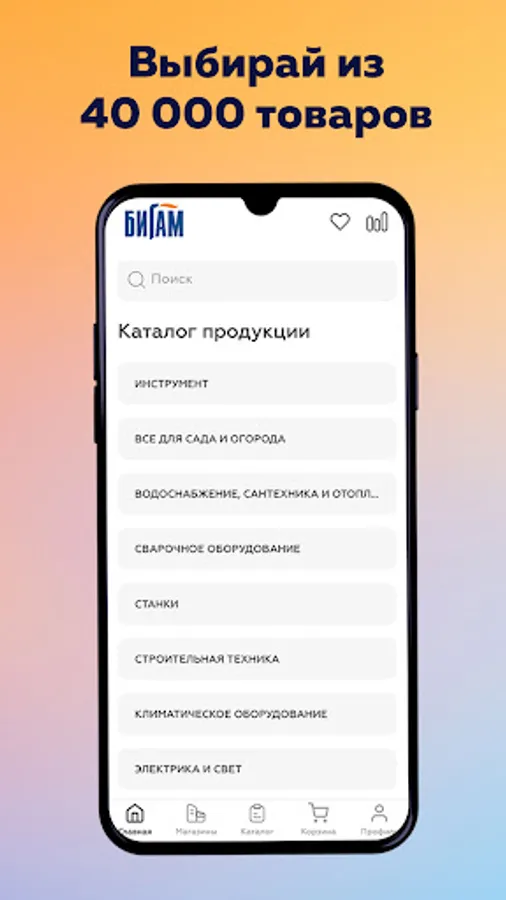 We are glad to welcome you to our mobile application, with which you can make quick and convenient purchases from your smartphone! "Bigam" is a federal network of Tool and Technique Centers.
